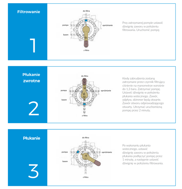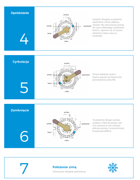 • Zawór boczny 6‑drogowy umożliwia filtrowanie, płukanie wsteczne, cyrkulację i opróżnianie basenu