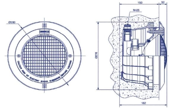 Wymiary lampy basenowej 30W ramka stalowa A316