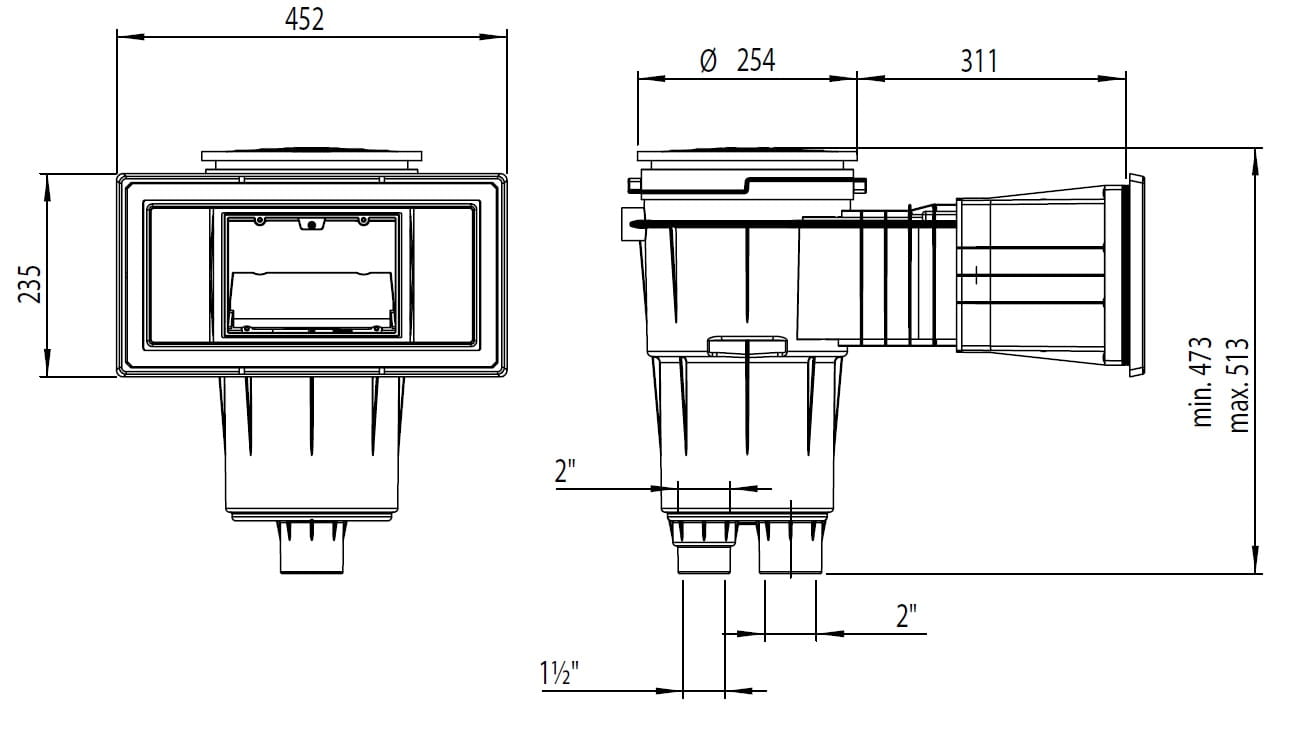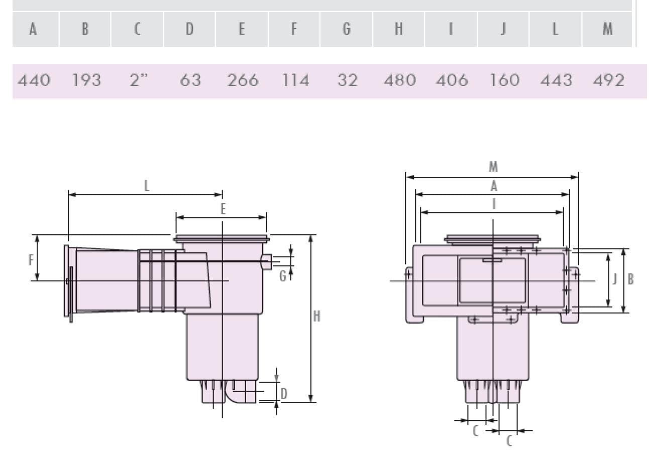 Wymiary skimmera szerokiego o przepływie 8m3/h i powierzchni zbierania z 25m2 lustra wody w basenie.