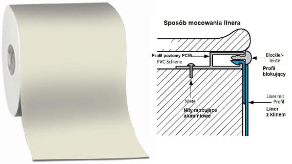 - Linery na krawędziach mają specyficzne zgrubienia, które pozwalają na sprawny montaż w profilach. Istnieją oczywiście różne rodzaje montaży, które znajdują się na obrazku poniżej. Uwaga! Profile oraz kliny blokujące nie są w zestawie z linerem. Należy je zamawiać osobno, jeśli jest taka potrzeba;